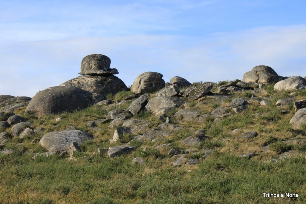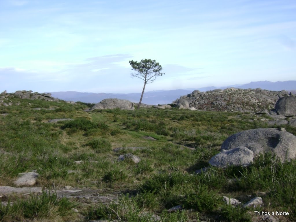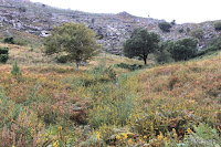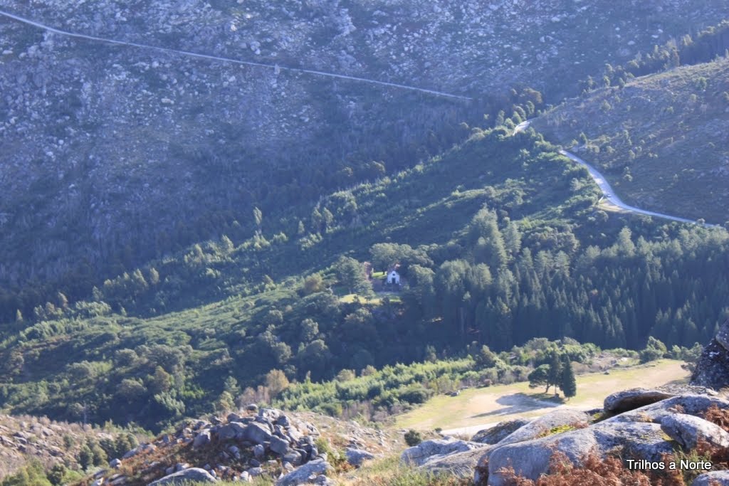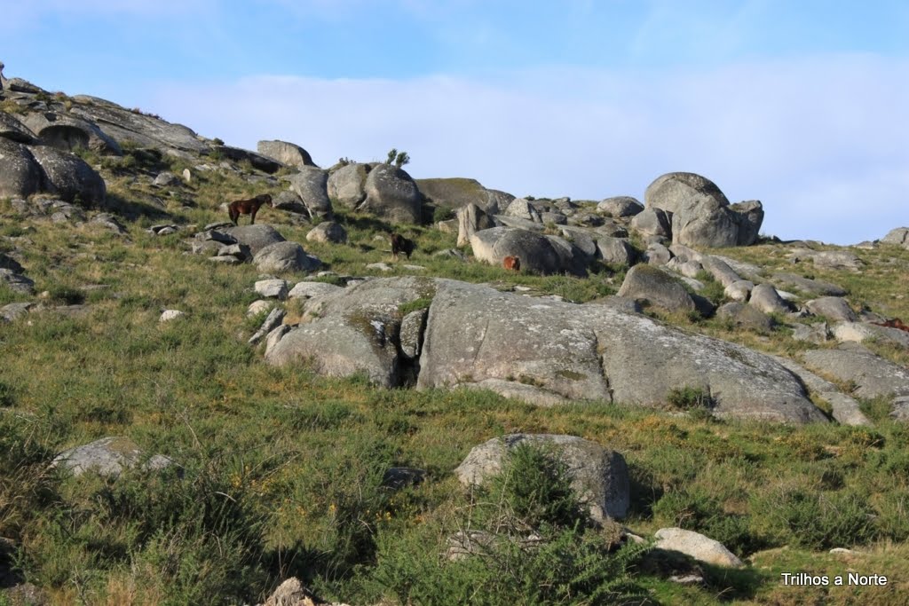 A parte seguinte do caminho era sempre a descer. Decidimos atalhar caminho, cortar mato. Ehh pah, como eu gosto de improvisar novos caminhos, ir á procura do desconhecido! Desta forma rapidamente chegamos á Chã do Guindeiro com o seu prado por onde se passeiam garranos em liberdade. Este é um local onde desaguam vários caminhos e é o ponto da serra onde se consegue fazer a travessia norte/sul e vice-versa, passagem obrigatória de romeiros a caminho do Mosteiro, vindos do lado sul da serra.