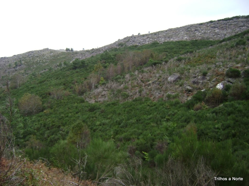 Depois de uns largos minutos a desfrutar daquelas vistas regressamos á ponte para retomar o caminho que nos levaria á aldeia, sempre a subir mas sem grande dificuldade. Nesta zona a paisagem muda devido a um facto preocupante, pois actualmente a Serra D'Arga está a ser invadida pelo arbusto háquea-picante ou háquea-espinhosa. Trata-se de um arbusto espinhoso de origem australiana e é uma espécie exótica considerada invasora na legislação portuguesa. Acho que é urgente fazer algo para controlar esta "invasão". É impossível atravessar uma zona com esta planta, pois pica que se farta.