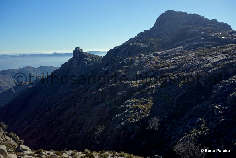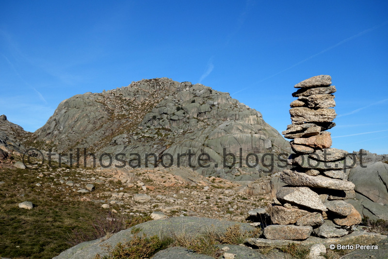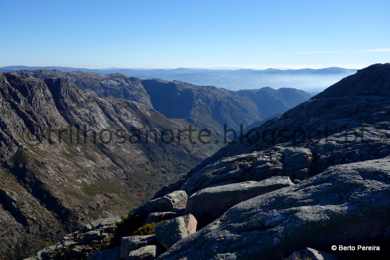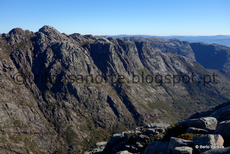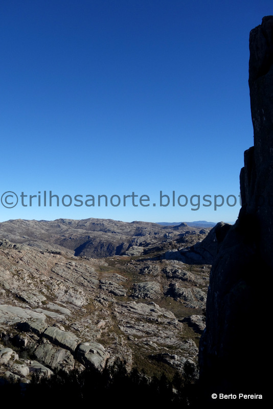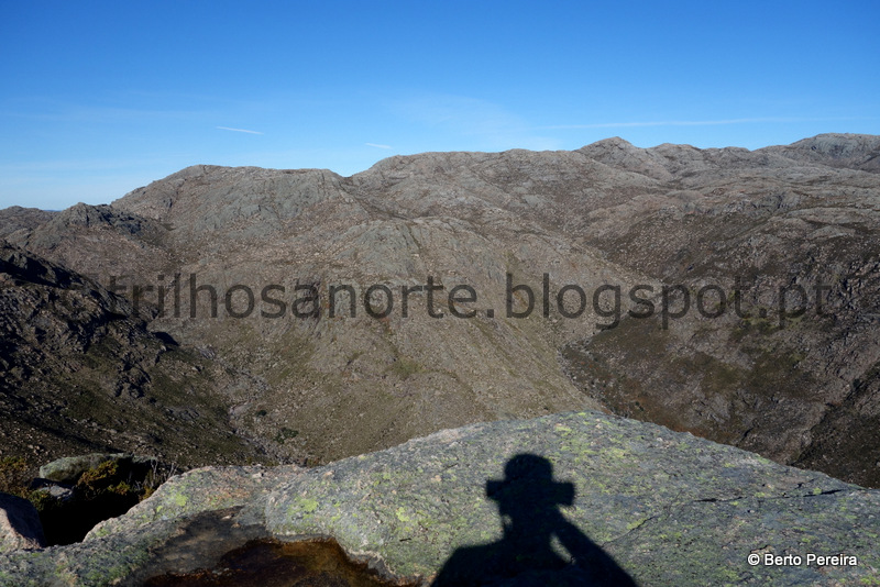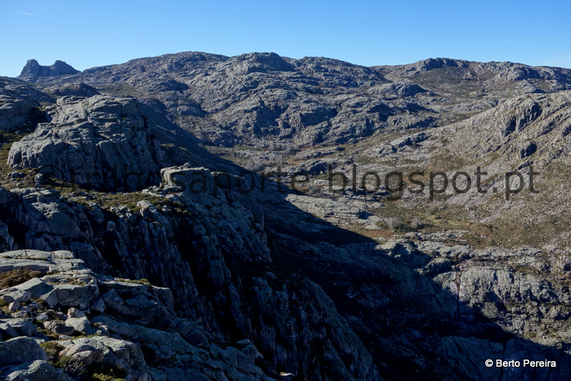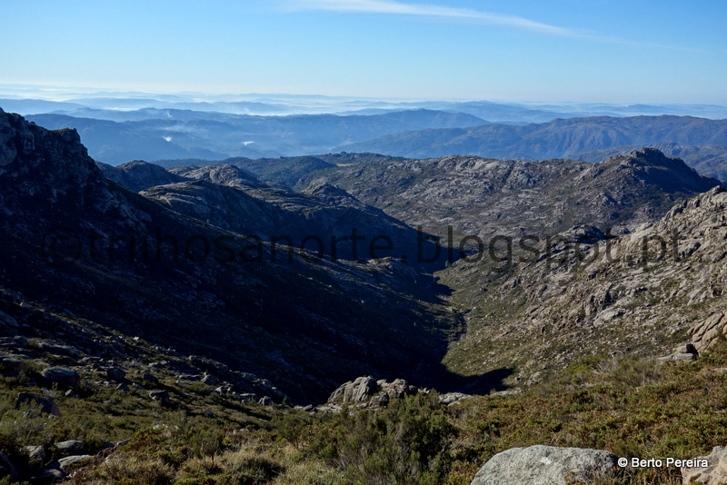 Findo o repasto e merecido descanso era tempo de regressar ao caminho. Recuámos até ao início da corga da Salgueiro e apontámos a sul pelo trilho que nos leva ao curral de Soengas e que segue em direcção ao de Iteiro d'Ovos, passando na base do Coucão. Daí ao Estreito foi um instante, flectindo depois á direita pelo espectacular trilho que desce até Entre Águas. Aí chegados optamos por subir directos ao colo na base da Arrocela, que nos dá depois acesso ao abrigo com o mesmo nome. Este trilho é simplesmente fabuloso. Sobe bastante mas á medida que ganhamos altitude e os horizontes se vão abrindo ficamos fascinados com o que nos é dado a ver.
