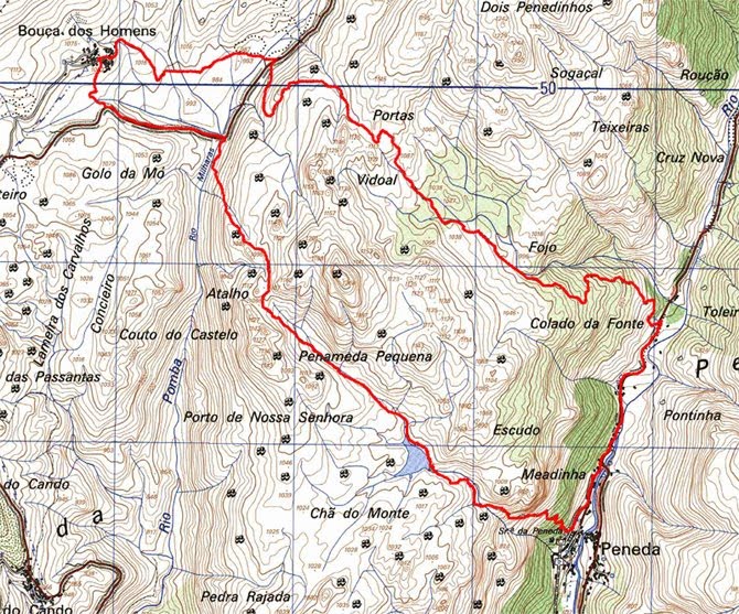 Este percurso realiza-se entre dois povoados serranos: a aldeia da Peneda e a Branda que por ela é gerida: Branda da Bouça dos Homens. Esta Branda foi ao longo da sua ancestral existência sempre considerada a Branda mais importante da Serra da Peneda.