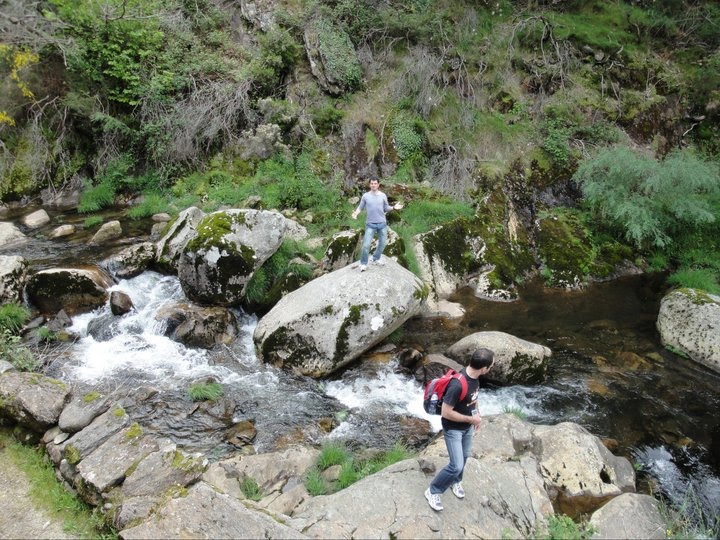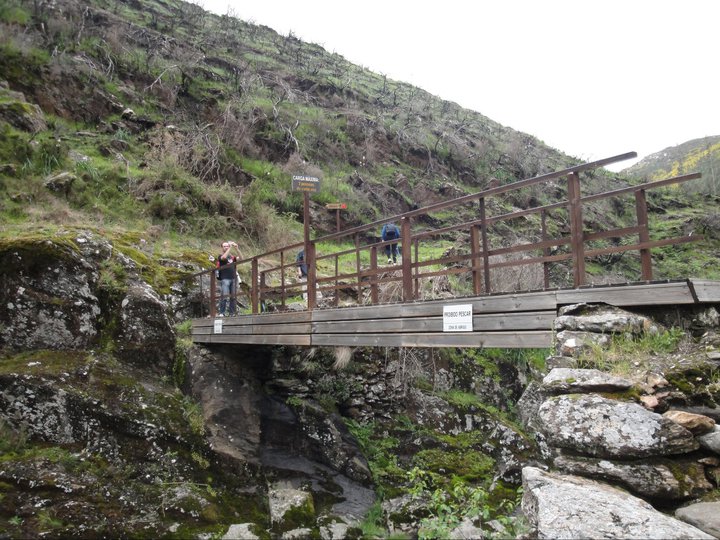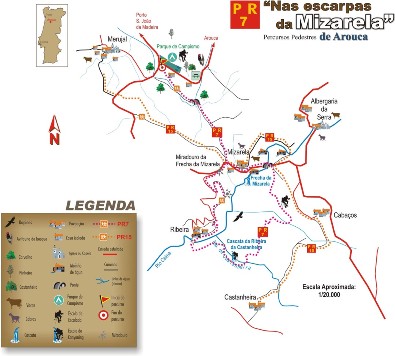 Descrição: Este percurso tem início e fim parque de lazer fronteiro ao parque de campismo do Merujal, através de um caminho que se dirige à Mizarela. Percurso pedestre linear. Chegando à Mizarela, passa-se pelo miradouro e prossegue-se descendo pela estrada de acesso à aldeia da Ribeira. 300 metros abaixo do miradouro, vira-se à esquerda, por um carreiro, entre um carvalhal, com vista soberba sobre a Frecha da Mizarela. Seguindo este carreiro, toca-se mais a baixo, numa curva, a referida estrada de acesso à aldeia da Ribeira que, logo de seguida, se deixa para continuar por outro carreiro, que desce abruptamente por entre escarpas com a bela cascata da ribeira da Castanheira, do lado de lá, em escadaria. Chegando ao ponto de confluência desta com o rio Caima, o caminho torna-se suave e, pela margem esquerda do rio rapidamente se chega à aldeia da Ribeira. Passada a aldeia, atravessa-se o rio num pequeno pontão, rumando-se à esquerda por um trilho que, subindo ao longo da margem direita do rio, chega à ribeira da Castanheira, acompanhando-a. Transposta esta, atinge-se a crista da escarpa leste e rapidamente se chega à ribeira dos Cabaços e à escola de escalada. Após a passagem de um colo toca-se o PR15, já junto à estrada de asfalto, que se toma à esquerda, chegando-se à aldeia da Mizarela. Aqui retoma-se o caminho do parque de merendas e do parque de campismo, onde se iniciou. | |||||||||||||||||||||||||||||||||||||||||||||||||||||||||||||||||||||||||||||||||||||||||||||||||||||||||||||||||||||||||||||||